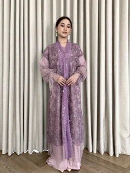 Outer dress yang memiliki cutting yang loose dan detail renda di bagian kerah depan. Ditaburi payet pada aplikasi renda sehingga menambah kesan mewah pada total looknya. Terdapat bukaan kancing kait di bagian depan. Terbuat dari perpaduan embroidery lace dilapisi chantilly dan dilengkapi dengan inner long dress lengan panjang berbahan satin armani yang lembut di kulit.