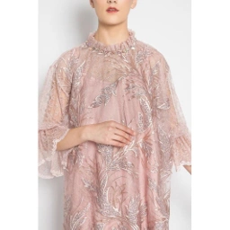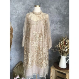 Dress dengan look yang mewah, elegan. di hiasi dengan motif daun dan dress yang berwarna gold, memberikan kesan percaya diri kepada si pemakai. Terdapat bukaan kancing di belakang. Terbuat dari perpaduan embroidery lace dilapisi chantilly dan dilapisi vuring berbahan satin armani yang lembut di kulit.
