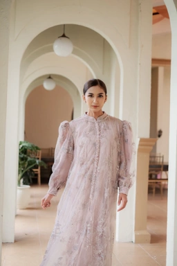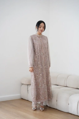 Dress dengan look yang mewah dan elegan bertabur payet pada bagian depan. Terdapat bukaan ritsleting di belakang. Terbuat dari perpaduan embroidery lace dilapisi chantilly dan dilapisi vuring berbahan satin armani yang lembut di kulit.